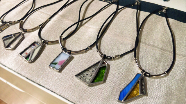アンティークなプレスガラスや現代のガラスを組み合わせて作ったネックレス等のアクセサリーなども展示しております。