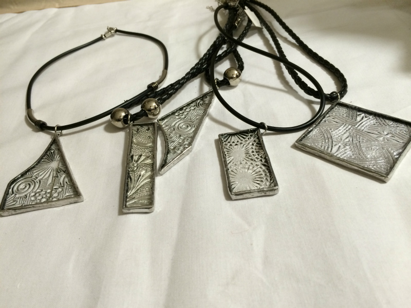 アンティークなプレスガラスや現代のガラスを組み合わせて作ったネックレス等のアクセサリーなども展示しております。