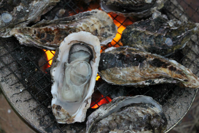 まずは、七輪で焼き牡蠣。