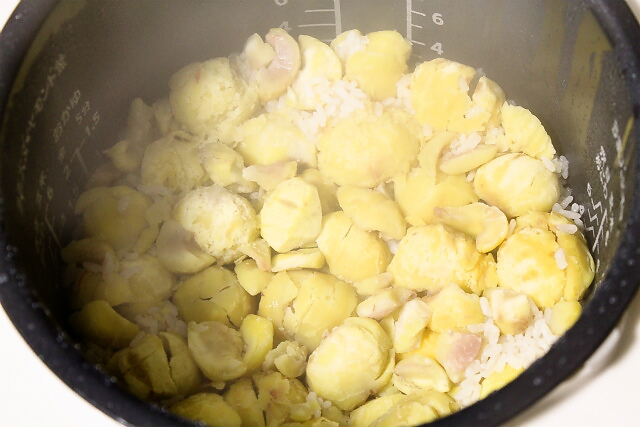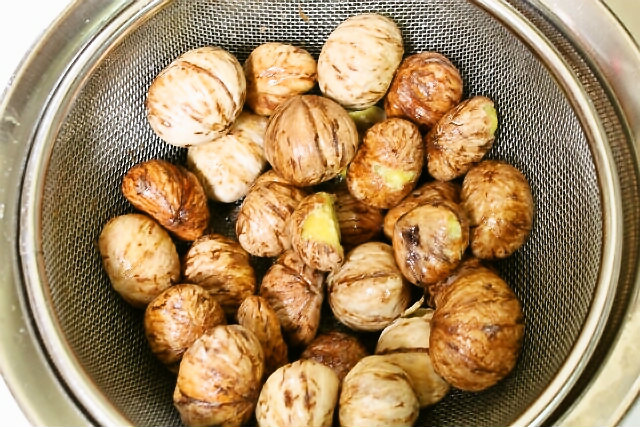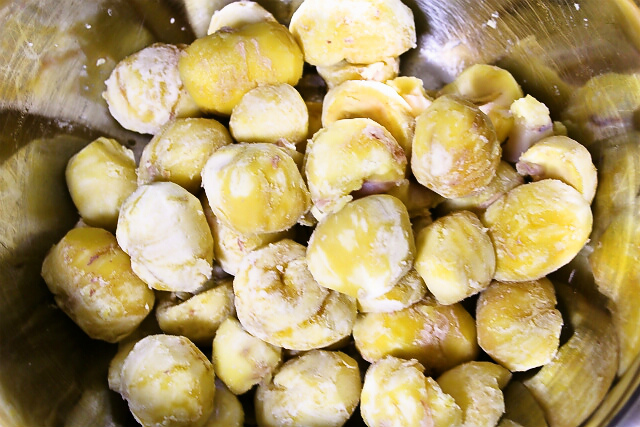 圧力鍋で1分くらい加圧して鬼皮を柔らかくしてから剥き剥き!