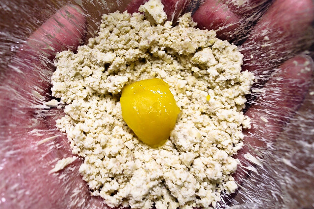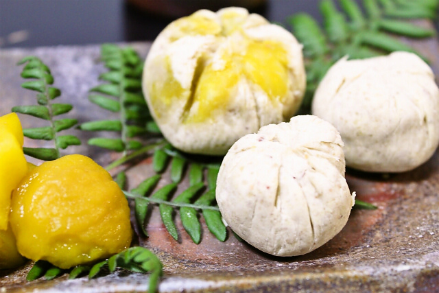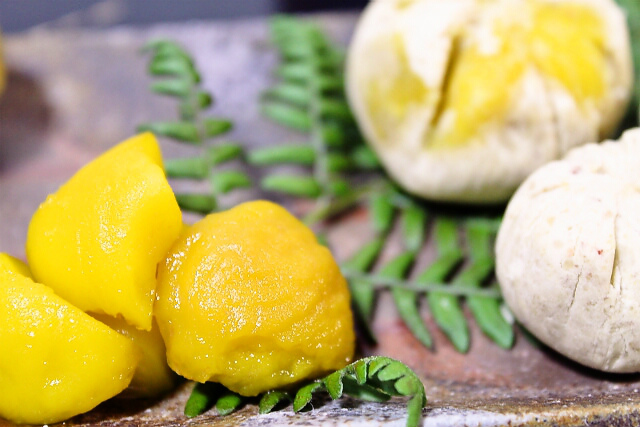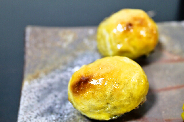 いいくらいの柔らかさになったら、栗を切るときに、横?に切っといた皮にこんもり持って、卵黄とお水を混ぜたやつ塗って、オーブントースターでチン!