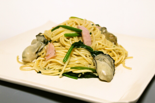 にんにくと鷹の爪を炒めて香りを出して、ハム、ほうれん草、牡蠣を投入。